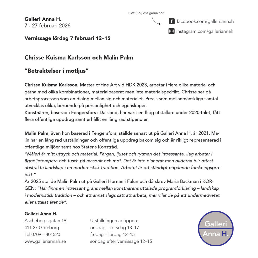 Malin Palm, även hon baserad i Fengersfors, ställde senast ut på Galleri Anna H. år 2021. Malin har en lång rad utställningar och offentliga uppdrag bakom sig och är rikligt representerad i offentliga miljöer samt hos Statens Konstråd.