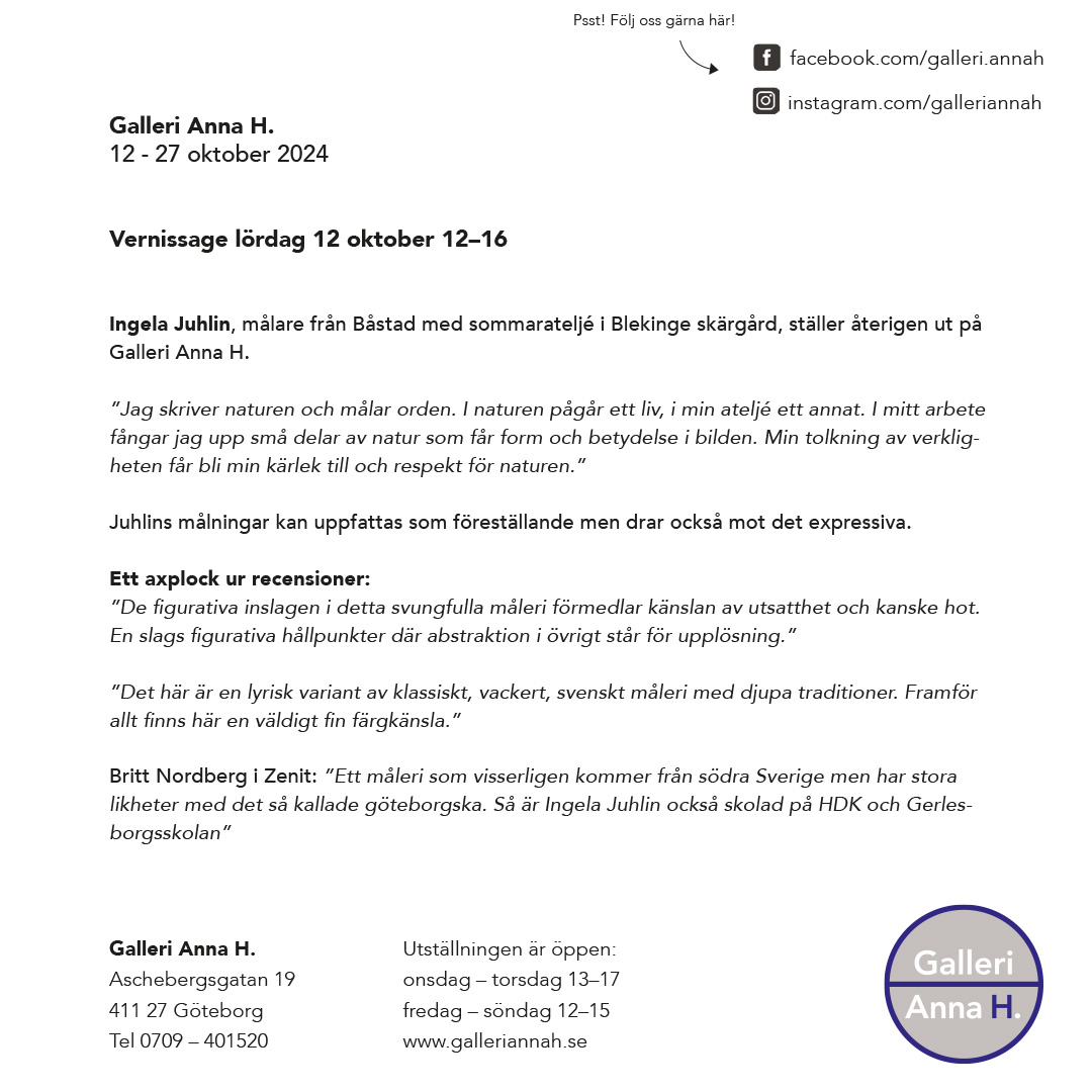 Ingela Juhlin, målare från Båstad med sommarateljé i Blekinge skärgård, ställer återigen ut på Galleri Anna H.