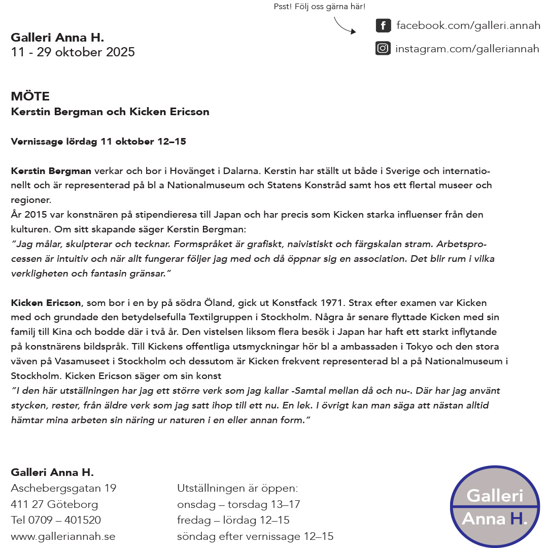Kerstin Bergman verkar och bor i Hovänget i Dalarna. Kerstin har ställt ut både i Sverige och internationellt och är representerad på bl a Nationalmuseum och Statens Konstråd samt hos ett flertal museer och regioner.