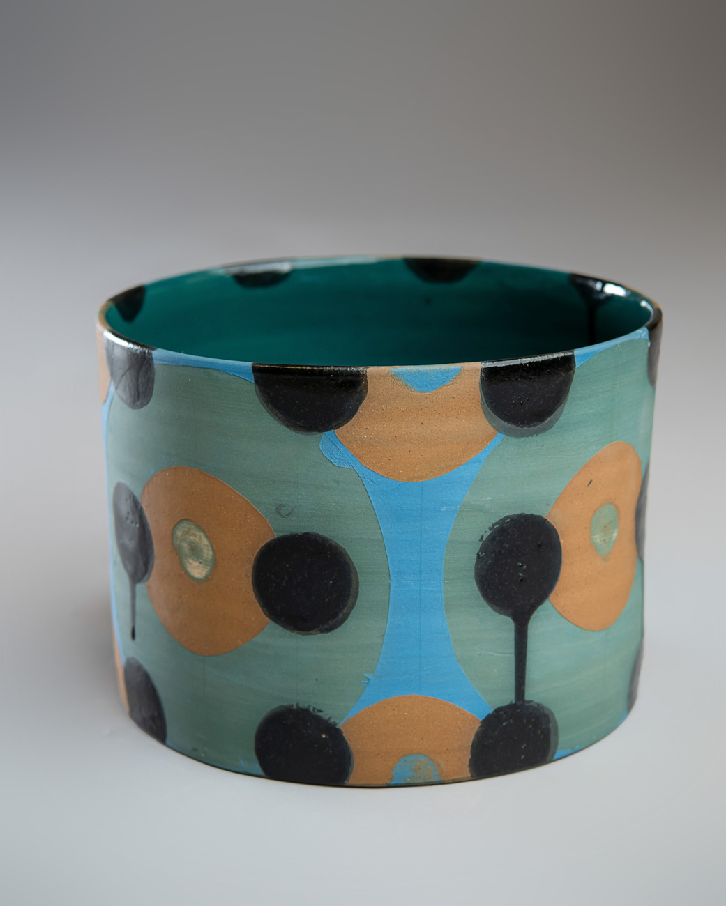 Carin Nordling, keramiker med verkstad i Åkersberga i Roslagen gick ut Konstfack 1983. ”Genom en beställning från ett tekniskt företag kom passaren och linjalen fram i min verkstad. Cirklar och streck växte fram i ett systematiskt mönster med till synes oändliga variationsmöjligheter. Ramarna var formen Klot och Cylinder i färgerna vitt, grått, svart och tegel. Med engober (infärgad lervälling) och blanka glasyrer blir det matt eller blankt. Dessa begränsade ramar triggade verkligen igång min kreativitet. Nu har jag utökat färgpaletten med alla mina färger i verkstaden, som senap, turkost och blått. Annars drejar jag enkla, odekorerade bruksföremål i fina färger, lätta att leva med till vardags och till fest.”